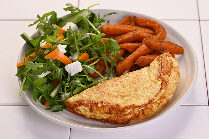 Ready cooked and folded cheese omelette. Made with British milk, British cheese and free-range British eggs. Packed 2 x 12. Suitable for vegetarians.