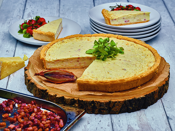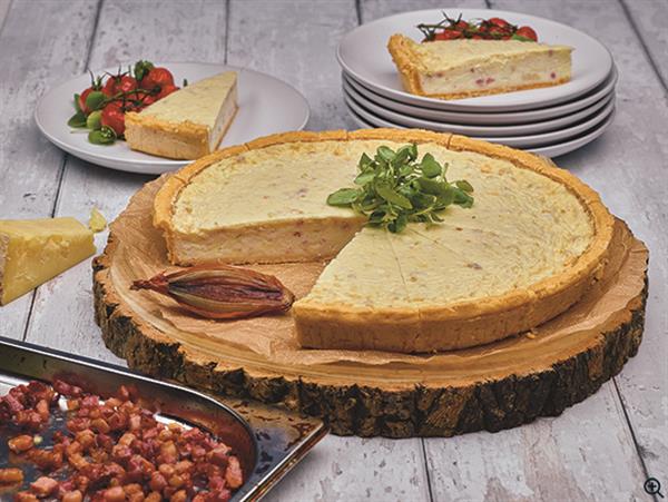 Ready-to-bake tartlet with a light egg, mature Cheddar, mozzarella, sun-dried tomato and basil filling, topped with creamy goat's cheese sprinkled with chives, all in golden, parsley- flecked shortcrust pastry.